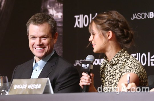 할리우드 배우 맷 데이먼(왼쪽), 알리시아 비칸데르가 8일 오전 서울 종로구 당주동 포시즌스호텔 서울에서 진행된 영화 '제이슨 본' 내한 기자회견에 참석해 질문에 답하고 있다.