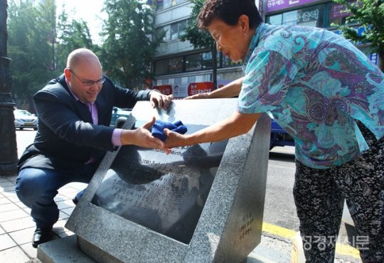 미국 인기 만화작가 온리 콤판이 8일 서울 중구 이순신 장군 생가터를 방문해 30년간 매일 이순신 장군 표석을 닦아온 \'이순신 할머니\' 이종임씨와 함께 표석을 닦고 있다. 사진= 여성경제신문 제공