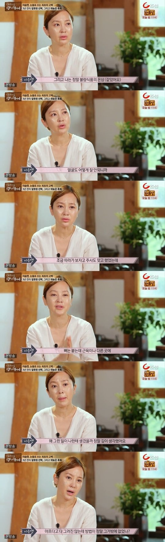 언제가 가장 힘들었느냐는 제작진의 물음에 이승연은 “그때 내가 너무 달렸을 시기다. 나는 불량식품의 온상 같았다. 얼굴도 어떻게 잘 안 되니까 유행을 따라가 보자고 주사도 맞고 했었다”고 말했다.