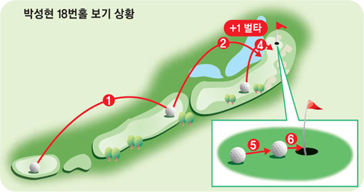 티샷까지는 좋았다. 공을 페어웨이 한 가운데 떨어뜨리며 최소한 연장으로 경기를 끌고 갈 것처럼 보였다. 그러나 220야드를 남겨두고 친 두 번째 샷이 꿈을 앗아갔다. 박성현은 캐디의 조언이 끝나기도 전에 스스로 가방에서 하이브리드 클럽을 꺼내들었다. 그리고 자신있게 스윙했다. 하지만 공이 왼쪽으로 휘어지면서 그린 옆 워터해저드에 빠졌다. 순간 우승의 꿈도 날아갔다. 4타 만에 그린에 올라온 박성현은 파 퍼트마저 놓치면서 공동 3위에 만족했다.