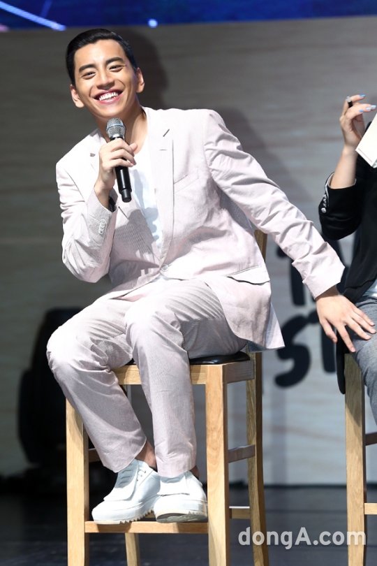 배우 왕대륙이 13일 오후 서울 이화여자대학교 삼성홀에서 열린 첫번째 팬미팅 기자회견에 참석해 질문에 답하고 있다.