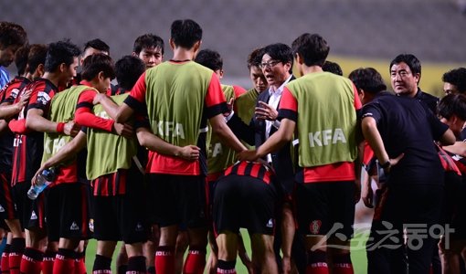 13일 서울월드컵경기장에서 열린 ‘2016 KEB 하나은행 FA컵’ 8강전 FC서울과 전남드래곤즈 경기에서 연장전을 앞두고 서울 황선홍 감독 선수들을 독려하고 있다.