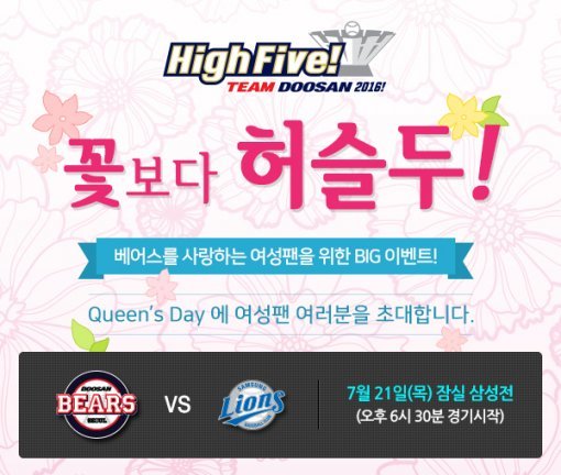 프로야구 두산베어스는 "21일 잠실 삼성전 홈경기를 '퀸스 데이(Queen’s Day)'로 지정하고 여성 팬을 위한 다양한 이벤트를 펼친다"고 19일 밝혔다.