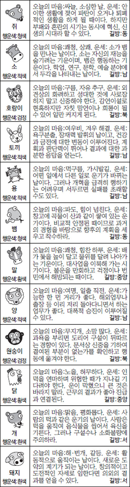 금일복권, 주식, 부동산매입 행운의 띠: 호랑이,말,개(토요일:토끼,양,돼지)