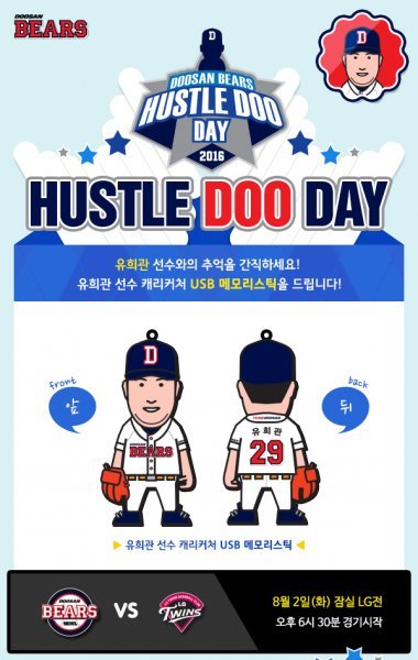 프로야구 두산베어스는 오는 8월 2일 잠실에서 열리는 LG와의 홈경기에 '허슬두데이(Hustle Doo Day)' 이벤트를 실시한다.