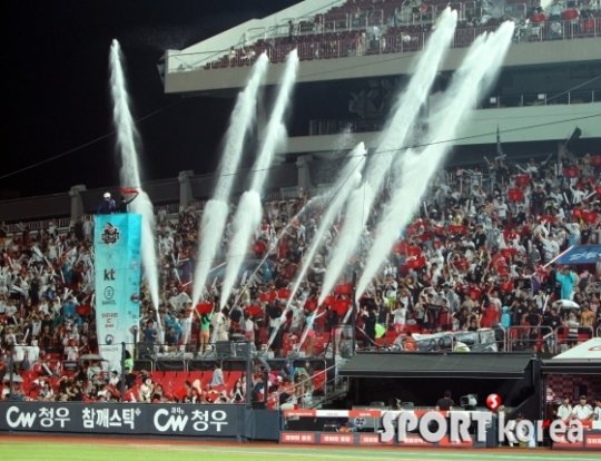 24일 오후 수원 kt위즈파크에서 열린 `2016 타이어뱅크 KBO 리그` kt 위즈와 삼성 라이온즈의 경기에서 kt가 `2016 GIGA 워터 페스티벌`을 가져 시원한 물대포를 관중석으로 살포하고 있다.