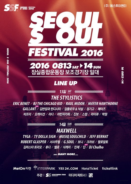 올 여름 최고의 이슈로 떠오르고 있는 2016서울소울페스티벌의 최종 라인업과 타임테이블이 공개 되었다. 최종 라인업에는 2016년 상반기 최고의 주가를 올리고 있는 “갈란트(GALLANT)”, “딘(DEAN)”이 추가됐다.