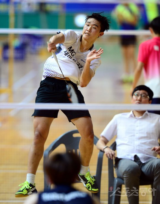 스포츠동아와 동아일보사가 주최하고 한국초등학교배드민턴연맹, 한국중고배드민턴연맹, 한국대학배드민턴연맹이 공동 주관하는 ‘이용대 올림픽제패기념 2016 화순 전국 초·중·고·대학교대항 배드민턴선수권대회’가 25일 전라남도 화순 하니움문화스포츠센터에서 열렸다. 남자대학단체전 백석대학교와 경남과학기술대학교의 경기에서 백석대학교 안진하가 스매싱을 날리고 있다.