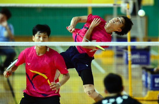 스포츠동아와 동아일보사가 주최하고 한국초등학교배드민턴연맹, 한국중고배드민턴연맹, 한국대학배드민턴연맹이 공동 주관하는 ‘이용대 올림픽제패기념 2016 화순 전국 초·중·고·대학교대항 배드민턴선수권대회’가 25일 전라남도 화순 하니움문화스포츠센터에서 열렸다. 남자고등부단체전 매원고등학교(강민혁-김원호)와 부산동고등학교(김태완-이상민)의 경기에서 매원고 강민혁(뒤)이 스매싱을 날리고 있다.