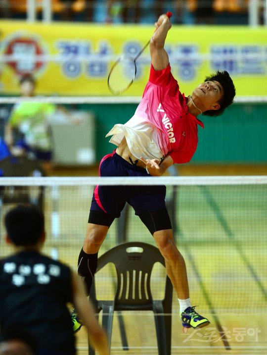 스포츠동아와 동아일보사가 주최하고 한국초등학교배드민턴연맹, 한국중고배드민턴연맹, 한국대학배드민턴연맹이 공동 주관하는 ‘이용대 올림픽제패기념 2016 화순 전국 초·중·고·대학교대항 배드민턴선수권대회’가 25일 전라남도 화순 하니움문화스포츠센터에서 열렸다. 남자고등부단체전 매원고등학교(강민혁)와 부산동고등학교(이상민)의 경기에서 매원고 강민혁이 스매싱을 날리고 있다.