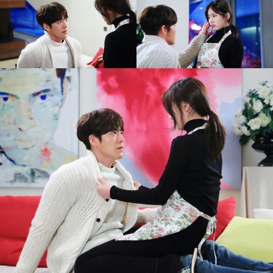무엇보다 김우빈과 배수지는 닿을 듯 말 듯 가까이 다가선, 돌발 스킨십 장면을 로맨틱하게 완성해 시선을 사로잡고 있다. 극중 소파에서 뒤로 넘어진 신준영의 멱살을 잡으려고 하던 노을이 갑자기 신준영이 몸을 일으키자 당황하게 되는 것. 이어 노을을 애틋한 눈빛으로 바라보던 신준영이 노을의 볼을 살짝 터치하면서, 갑작스러운 ‘반전 상황’이 펼쳐진다. 이에 놀라는 노을과 시종일관 진지한 표정의 신준영이 묘한 분위기를 자아내면서 기대감을 높이고 있다.