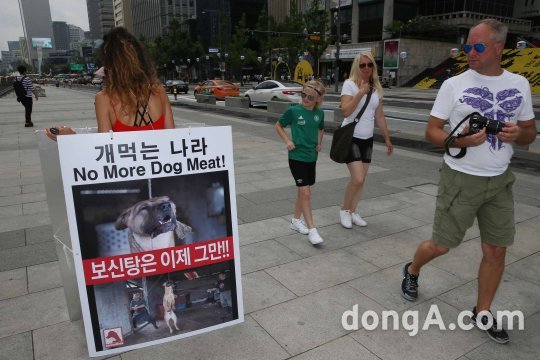 중복을 하루 앞둔 26일 오후 서울 광화문광장에서 영국의 한 동물보호 활동가가 개 식용을 반대하는 1인 시위를 하고 있다.