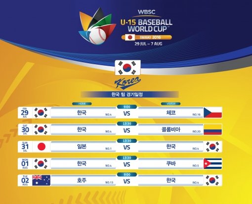 SBS스포츠는 오는 29일부터 일본 이와키에서 열리는 2016 WSBC 15세 이하 야구월드컵 대한민국 전 경기를 생중계 한다. 15세 이하 대표팀의 세계 무대 돌풍을 기대해 볼 수 있는 대회다.