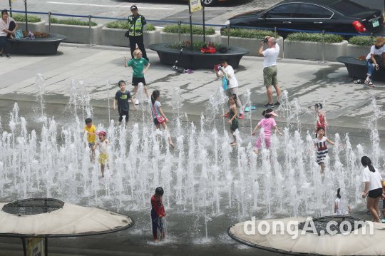연일 찜통 더위가 계속되는 가운데 26일 오후 서울 광화문광장에서 어린이들이 물놀이를 하며 즐거워 하고 있다.