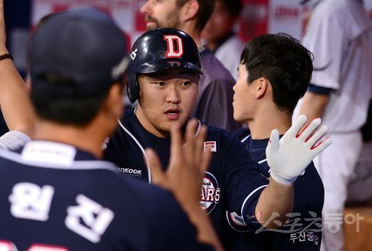 26일 서울 고척스카이돔에서 ‘2016 타이어뱅크 KBO 리그’ 두산베어스와 넥센히어로즈 경기가 열렸다. 2회초 무사 두산 오재일이 우월 솔로 홈런을 날리고 그라운드를 돌고 홈인해 더그아웃에서 하이파이브 하고 있다.