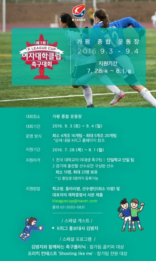 한국프로축구연맹(총재 권오갑, 이하 ‘연맹’)이 숙명여자대학교와 함께 오는 9월 3일과 4일 양일에 걸쳐 가평종합운동장에서 열리는 ‘제 7회 K리그컵 여자대학클럽축구대회’참가팀을 모집한다.
