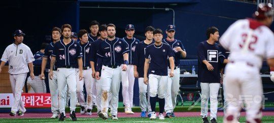 28일 서울 고척스카이돔에서 열린 ‘2016 타이어뱅크 KBO리그’ 넥센 히어로즈와 두산 베어스의 경기에서 넥센이 12-1 대승을 거두며 위닝 시리즈를 기록했다. 경기 후 두산 선수들이 굳은 표정으로 원정 응원 온 팬들에게 인사를 하기 위해 그라운드로 나오고 있다.