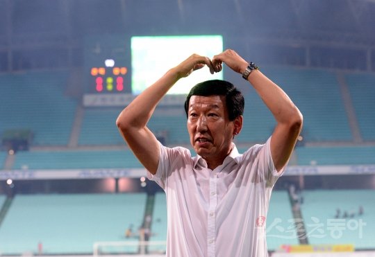 30일 전주 월드컵경기장에서 열린 ‘현대오일뱅크 K리그 클래식 2016’ 전북 현대와 광주 FC의 경기에서 전북이 광주에 3-0으로 승리한 뒤 최강희 감독이 팬들을 향해 하트를 그리고 있다. 전북은 이날 승리로 개막이후 23경기 무패 신기록을 세웠다.