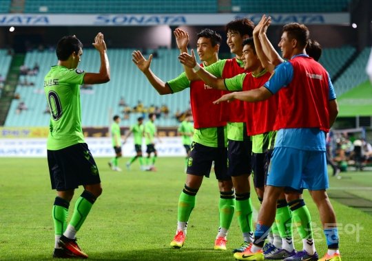 30일 전주 월드컵경기장에서 열린 ‘현대오일뱅크 K리그 클래식 2016’ 전북 현대와 광주 FC의 경기에서 전북 레오나르도가 팀의 세번째 골을 성공한 뒤 동료들과 기쁨을 나누고 있다.
