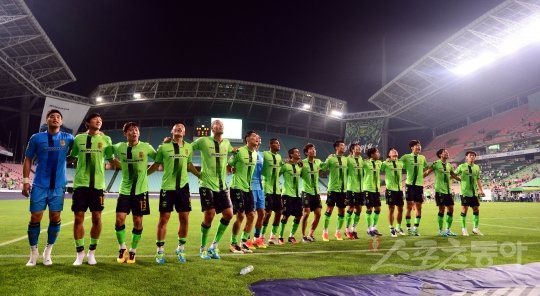 30일 전주 월드컵경기장에서 열린 ‘현대오일뱅크 K리그 클래식 2016’ 전북 현대와 광주 FC의 경기에서 전북이 광주에 3-0으로 승리한 뒤 선수들이 그라운드에서 팬들을 향해 세리머니를 펼치고 있다. 전북은 이날 승리로 개막이후 23경기 무패 신기록을 세웠다.