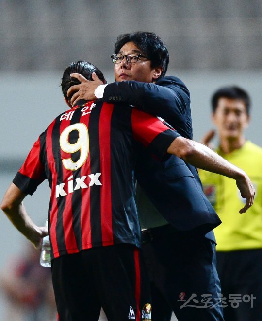 31일 서울 상암월드컵경기장에서 열린 ‘현대오일뱅크 K리그 클래식 2016’ FC 서울과 포항 스틸러스의 경기에서 서울 데얀이 팀의 두번째 골을 성공한 뒤 황선홍 감독의 축하를 받고 있다.