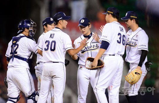 31일 서울 잠실야구장에서 ‘2016 타이어뱅크 KBO 리그’ 한화이글스와 두산베어스 경기가 열렸다. 10-4 승리를 거두며 4연패에서 탈출하며 시즌 60승 고지에 오른 두산 선수들이 하이파이브 하고 있다.