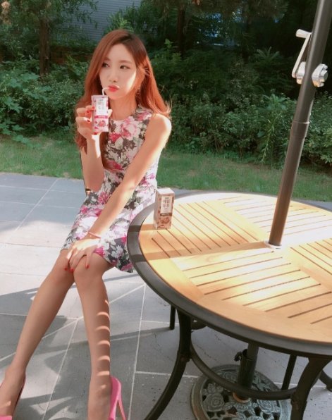 사진 속 예정화는 개구쟁이같이 장난스러운 표정을 지으며 두유를 마시고 있다. 꽃무늬 원피스와 핑크색 하이힐로 싱그러운 매력을 뽐내며 시선을 사로잡았다.