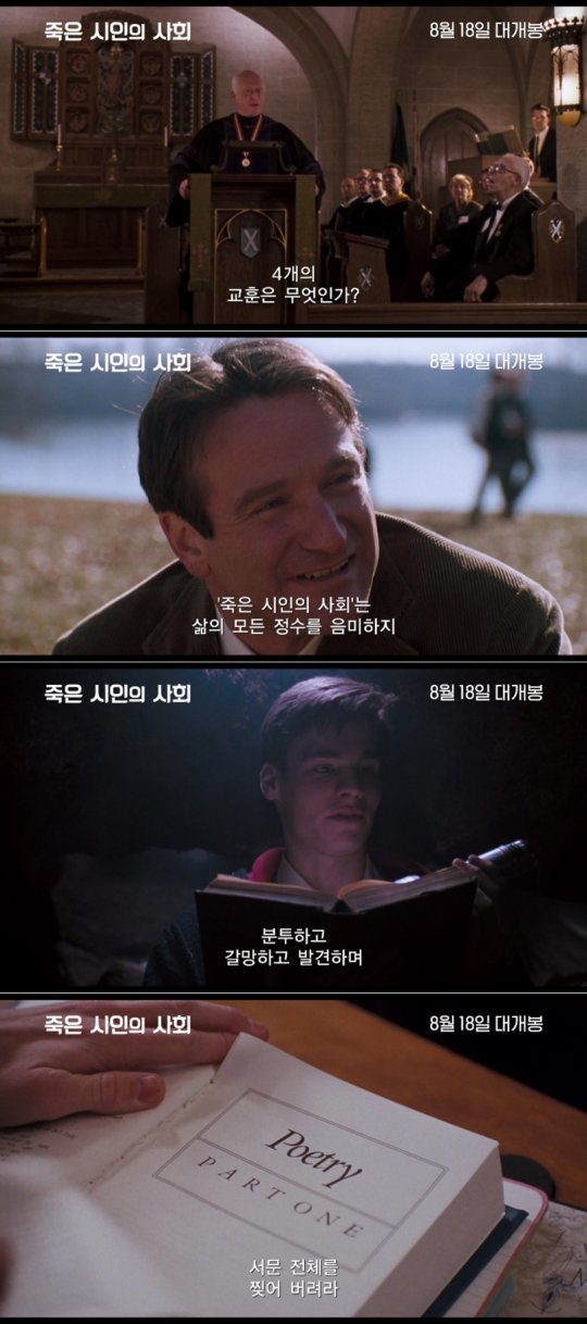 메인 예고편으로 더욱 이목을 집중시키고 있는 영화 ‘죽은 시인의 사회’는 오는 8월 18일 리마스터링 재개봉하여 다시 한 번 영화 팬들을 감동시킬 예정이다.