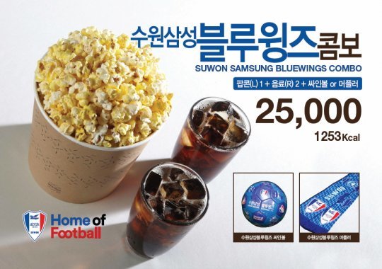‘수원삼성블루윙즈 콤보’는 팝콘(L), 음료(R) 두 잔, 수원삼성 선수들의 친필 싸인이 담긴 싸인볼 혹은 머플러로 구성됐으며, 싸인볼과 머플러는 원하는대로 선택할 수 있다. 가격은 2만 5천원으로, 9일(화)부터 구매 가능하다.