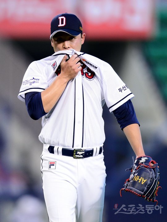 4일 서울 잠실야구장에서 ‘2016 타이어뱅크 KBO리그’ 두산 베어스와 LG 트윈스의 경기가 열렸다. 4회까지 3실점을 허용한 두산 선발 안규영이 이닝종료 후 더그아웃으로 걸어오고 있다.