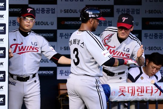 4일 서울 잠실야구장에서 ‘2016 타이어뱅크 KBO리그’ 두산 베어스와 LG 트윈스의 경기가 열렸다. 4회초 1사 2, 3루에서 두산 안규영의 폭투 때 득점에 성공한 LG 히메네스가 양상문 감독 및 코치의 환영을 받고 있다.