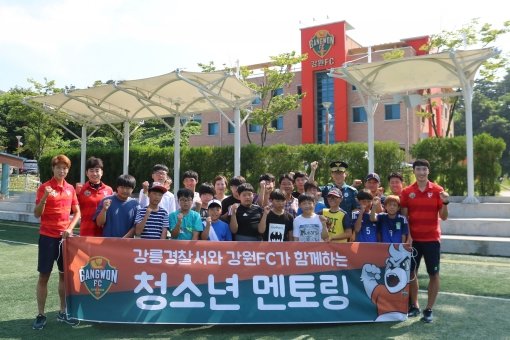 프로축구 K리그 챌린지 강원FC가 4일 오렌지클럽하우스 천연잔디구장에서 강릉경찰서와 함께 학교 폭력 예방을 위한 ‘청소년 멘토링’ 프로그램 첫 회를 실시했다.