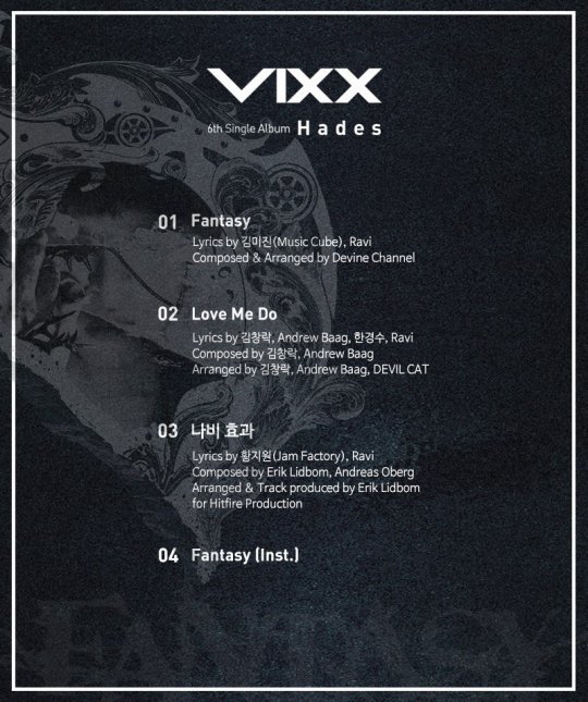 빅스는 5일 정오 공식 소셜 채널을 통해 ‘빅스 2016 컨셉션(VIXX 2016 CONCEPTION)’ 두 번째 작품이자 여섯 번째 싱글 앨범인 ‘하데스(Hades)’의 트랙리스트를 공개했다.