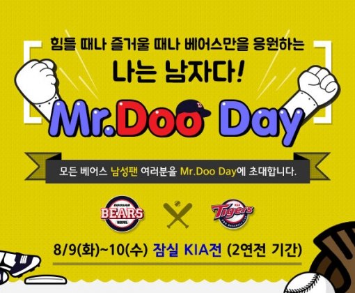 프로야구 두산베어스가 9일(화)부터 잠실에서 열리는 KIA와의 홈 2연전에 남성팬을 위한 맞춤형 이벤트인 '미스터두데이(Mr.Doo Day)'를 진행한다.