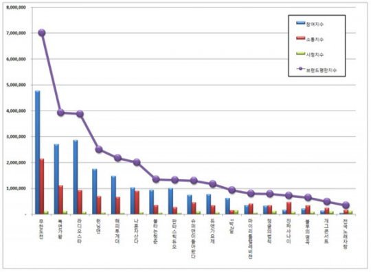 한편 이번 조사는 한국기업평판연구소가 7월 5일부터 8월 5일까지 예능프로그램 17개의 브랜드 빅데이터 3억 1409만 7164개를 분석한 결과다. (브랜드 참여량, 미디어량, 소통량 각각 측정) 브랜드 평판지수는 브랜드 빅데이터를 추출하고 소비자 행동분석을 하여 참여가치, 소통가치, 미디어가치, 소셜가치로 분류하고 가중치를 두어 나온 지표다.
