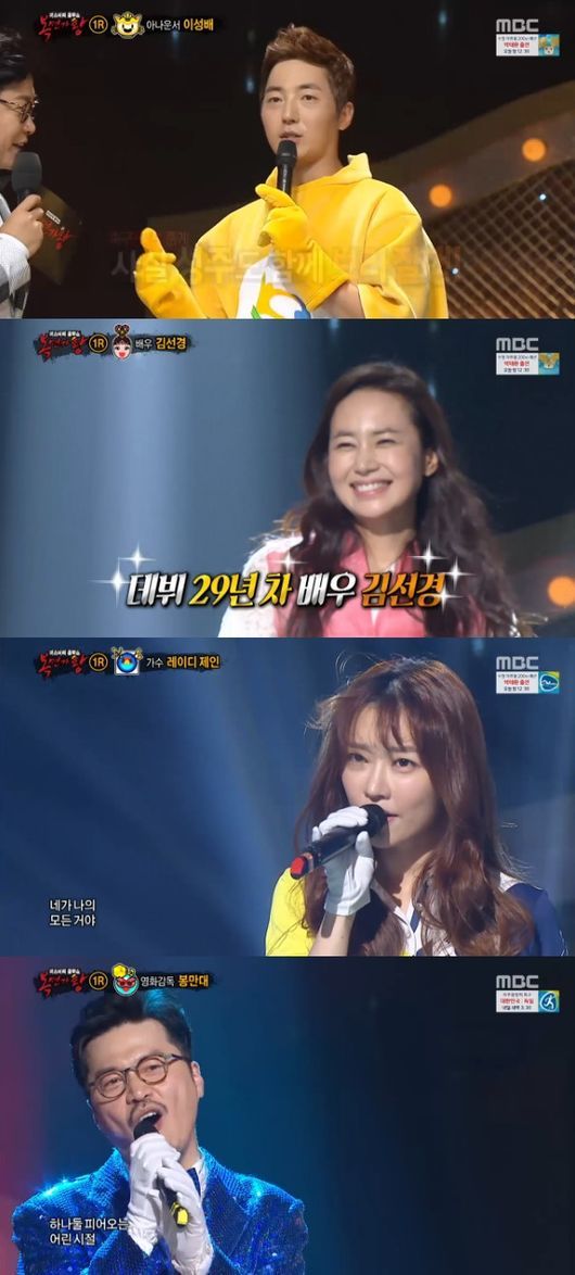 MBC ‘일밤-복면가왕’ 7일 방송에는 아나운서 이성배, 뮤지컬 배우 김선경, 가수 레이디제인, 감독 봉만대 등이 등장해 로맨틱 흑기사(로이킴)를 꺾고 새로운 가왕이 된 불광동 휘발유에 도전했다.