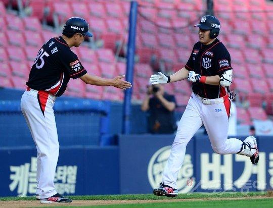 7일 잠실야구장에서 ‘2016 타이어뱅크 KBO 리그’ LG 트윈스와 kt 위즈의 경기가 열렸다. 3회초 2사 1루에서 kt 유한준이 LG 선발 허프를 상대로 역전 투런홈런을 친 후 박계원 코치와 하이파이브를 하고 있다.