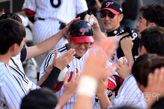 7일 잠실야구장에서 ‘2016 타이어뱅크 KBO 리그’ LG 트윈스와 kt 위즈의 경기가 열렸다. 3회말 선두타자로 나온 LG 유강남이 동점 솔로홈런을 친 후 더그아웃에서 동료들의 축하를 받고 있다.