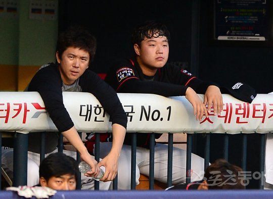 7일 잠실야구장에서 ‘2016 타이어뱅크 KBO 리그’ LG 트윈스와 kt 위즈의 경기가 열렸다. 3회말 1사 3루에서 교체 된 kt 선발 박세진(오른쪽)이 굳은 표정으로 경기를 지켜보고 있다.