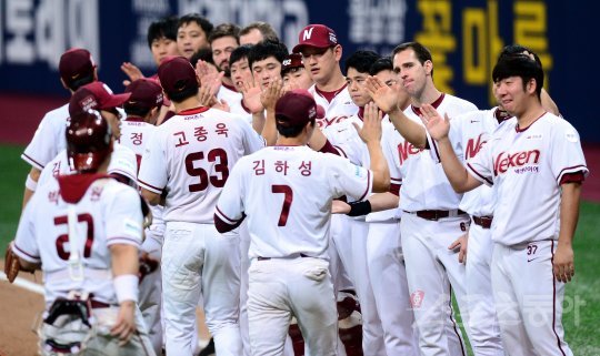 7일 서울 고척스카이돔에서 ‘2016 타이어뱅크 KBO리그’ 넥센 히어로즈와 SK 와이번스의 경기가 열렸다. 넥센이 SK에 4-1로 승리한 뒤 선수들이 그라운드에서 기쁨을 나누고 있다.
