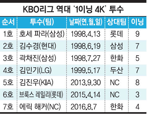 이론적으로는 ‘스트라이크아웃 낫아웃’이 있기 때문에 1이닝 4K가 아니라 5K, 6K도 기록될 수는 있다. 그러나 아직 KBO리그에서 1이닝 4K가 최고 기록이다.