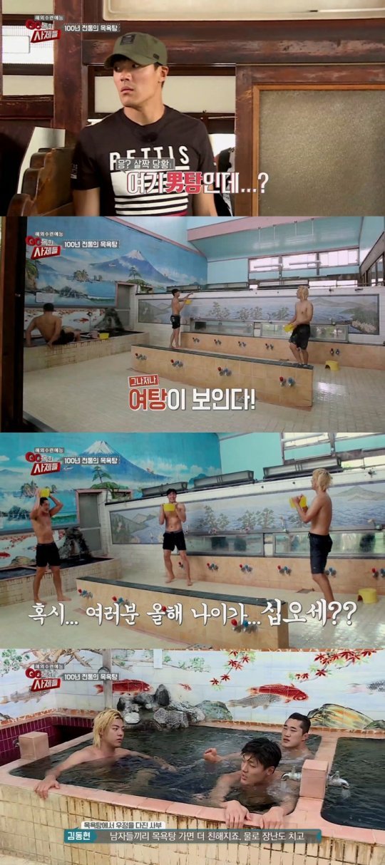 이재윤-김동현-강남은 100년 전통의 목욕탕을 방문했다. 하지만 입장 하자마자 세 사람은 남녀불문 오픈되어 있는 탈의실은 물론, 까치발만 들면 남탕과 여탕의 내부를 훤히 들여다볼 수 있는 특이한 구조의 일본 목욕탕 구조에 놀라움을 감추지 못했다. 하지만 세 사람은 이내 자신감 넘치는 모습으로 탈의를 감행, 보기만 해도 훈훈한 명품 몸매를 뽐내며 브로맨스 케미를 발산했다는 후문이다.