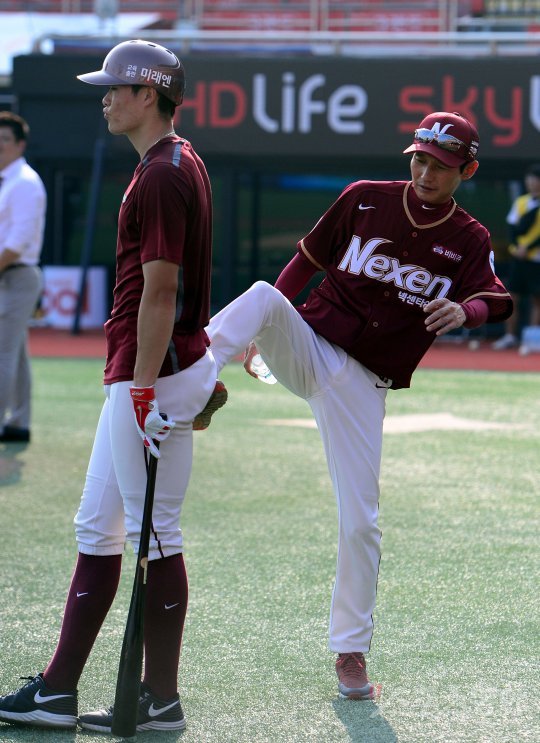 9일 수원 kt위즈파크에서 ‘2016 타이어뱅크 KBO리그’ kt 위즈와 넥센 히어로즈의 경기가 열린다. 경기를 앞두고 넥센 염경엽 감독이 임병욱(왼쪽)에게 장난을 치고 있다.