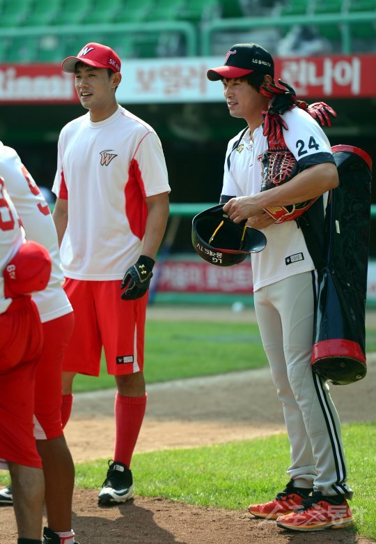 9일 인천 SK행복드림구장에서 ‘2016 타이어뱅크 KBO리그’ SK 와이번스와 LG 트윈스의 경기가 열린다. 경기전 SK 이명기와 LG 임훈이 이야기를 나누고 있다.
