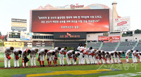 9일 인천 SK행복드림구장에서 ‘2016 타이어뱅크 KBO리그’ SK 와이번스와 LG 트윈스의 경기가 열린다. 경기에 앞서 양팀 선수들이 그라운드에 도열해 프로야구 승부조작에 대해 팬들에게 사죄하고 있다.