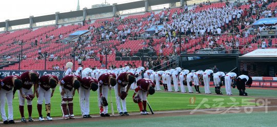 9일 수원 kt위즈파크에서 ‘2016 타이어뱅크 KBO리그’ kt 위즈와 넥센 히어로즈의 경기가 열렸다. 경기에 앞서 양팀 선수들이 그라운드에 도열해 프로야구 승부조작에 대해 팬들에게 고개 숙여 사죄하고 있다.
