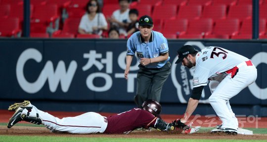 9일 수원 kt위즈파크에서 ‘2016 타이어뱅크 KBO리그’ kt 위즈와 넥센 히어로즈의 경기가 열렸다. 5회초 1사 넥센 박정음이 2루 방면 안타를 쳤지만 오버런으로 1루로 귀루했지만 태그아웃 당하고 있다.
