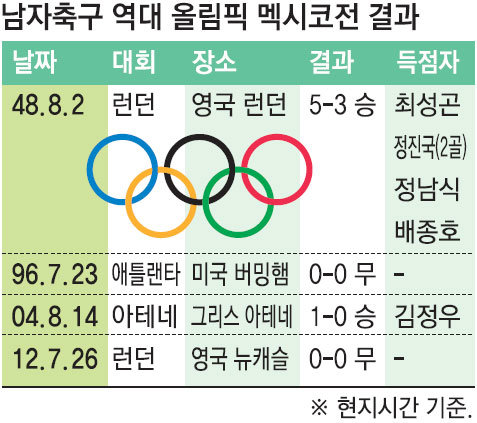 한국은 1948년 런던대회를 시작으로 올림픽 본선에서 멕시코에는 한 번도 패하지 않았다. 23세 이하로 연령제한이 도입된 이후 펼쳐진 1996년 애틀랜타대회에선 0-0으로 비겼다. 2004아테네올림픽에선 김정우의 결승골로 1-0 승리를 챙겼다. 이를 발판 삼아 한국은 당시 대회 8강에 진출했다. 2012런던올림픽 때는 조별리그 1차전에서 격돌했다. 두 팀은 조심스럽게 경기를 운영한 끝에 0-0으로 비겼다. 이 대회에서 멕시코는 금메달, 한국은 사상 첫 올림픽 동메달을 목에 걸었다.