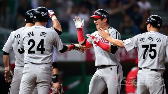 9일 인천 SK행복드림구장에서 ‘2016 타이어뱅크 KBO리그’ SK 와이번스와 LG 트윈스의 경기가 열렸다. 5회초 1사 만루에서 LG 오지환이 SK 신재웅을 상대로 우월 만루홈런을 쏘아올린 뒤 동료들의 환영을 받고 있다.