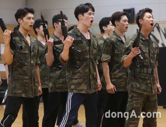 배우 오만석이 10일 오후 서울 충무아트센터 스튜디오A 연습실에서 열린 뮤지컬 '그날들' 연습실 현장공개에서 하이라아트 공연을 시연하고 있다.